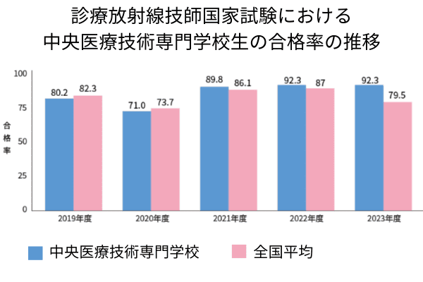 中央医療技術専門学校では国家試験対策に力を入れており、2023年度の国家試験合格率は94.3%で、全国平均を大きく上回っています。