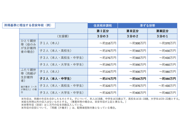 所得の基準と年収の目安は以下の通りです。